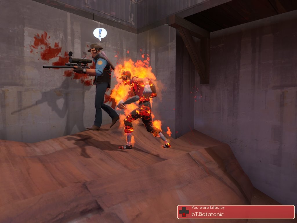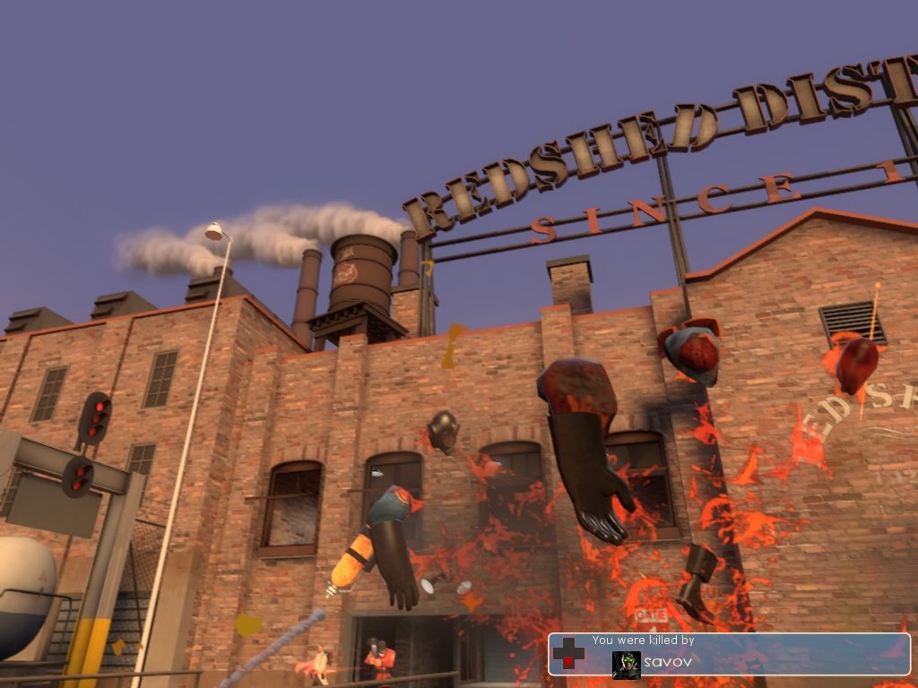Aquí radica una de las claves de la brillantez de TF2. Este es un juego en el que no hace falta ser una máquina de matar para ser útil. Simplemente saber posicionarse, distraer o crear disrupción (lo que en términos técnicos llamamos putear a la peña) son habilidades tan útiles o más que la pura habilidad para acumular frags, lo que dota a TF2 de una profundidad y variedad de tácticas que rara vez se explora en FPSs más tradicionales. Una partida que jugué en 2fort es un claro ejemplo de lo que digo. 2fort es un mapa clásico de capturar la bandera en el que hay dos fortalezas frente a frente. La zona central del mapa (la zona neutra que no pertenece a ningún equipo) tiene tres niveles verticales claramente diferenciados. El nivel donde se combate a pie tiene un puente de madera que cruza, de fuerte a fuerte, un foso con agua. El foso es el nivel más bajo en el que hay entradas a las bases por las “alcantarillas”. El nivel alto está en las fortalezas y tiene ventanales y balcones desde donde se suelen apostar francotiradores para ofrecer cobertura a los que combaten en el puente. Lo que yo hice un buen día fue coger un pyro, equipar la pistola de bengalas que recientemente había conseguido, y colocarme en la zona alta disparando a los francotiradores de la fortaleza enemiga. Las bengalas no hacen daño suficiente para matar por si solas, y son proyectiles lentos, pero prenden fuego al enemigo y eso, para un francotirador mirando concentrado por la mira de su rifle, despista mucho. A lo largo de la partida otros jugadores se dieron cuenta de lo útil de mi táctica y pronto había pyros en ambas fortalezas, cubriendo el cielo de bengalas rojas y azules que viajaban de un lado a otro. Buena partida.
