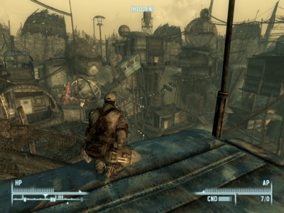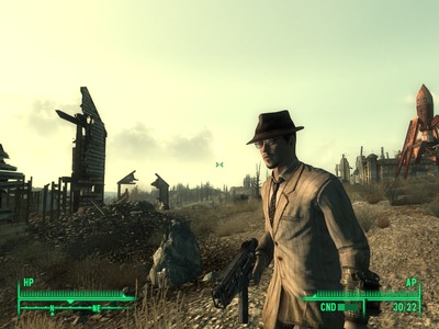En diseño de videojuegos hay un recurso que se ha dado en llamar la “Ley de Miyamoto”. Shigeru Miyamoto decía: “Al principio del juego, hay que enseñarle al jugador un lugar que esté justo fuera de su alcance”. Es una forma de poner la zanahoria en el palo y mantener el interés del jugador. Esta ley es seguida religiosamente por prácticamente todos los diseñadores modernos de juegos narrativos. También hay otra cosa a la que llamaré la “Ley de Newell” en base a una cita del presidente de Valve, Gabe Newell: “No puedes enseñarle al jugador una bomba enorme y luego no dejar que la reviente”. Por suerte, Fallout 3 no ha olvidado esta “ley”, y es posible detonar la bomba nuclear que hay en el centro del pueblo, sustituyéndolo por un enorme cráter irradiado y de paso contemplando unos espectaculares fuegos artificiales.