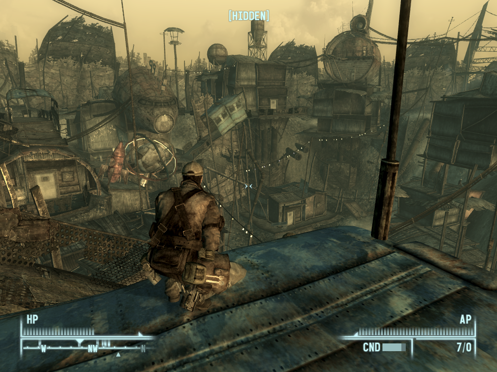 Como iba diciendo, Megaton será probablemente la “primera parada” del jugador. No es una buena primera impresión desde luego. Horribles texturas de metal oxidado recubren por doquier una ciudad fea y difícil de navegar. Megaton puede considerarse el tutorial parte 2. La parte de quests y mundo abierto. La ciudad ofrece una gran variedad de opciones para personajes de todo tipo, científicos, guerreros, ladrones, buenos, malvados… es un lugar que nos muestra un poco de lo que está por venir, quizá de una forma poco sutil y un tanto forzada. Aunque hay algunas quests interesantes en este lugar, su función es poco más que la de ciudad introductoria. Su feo diseño parece invitarnos a que nos marchemos de allí cuanto antes.