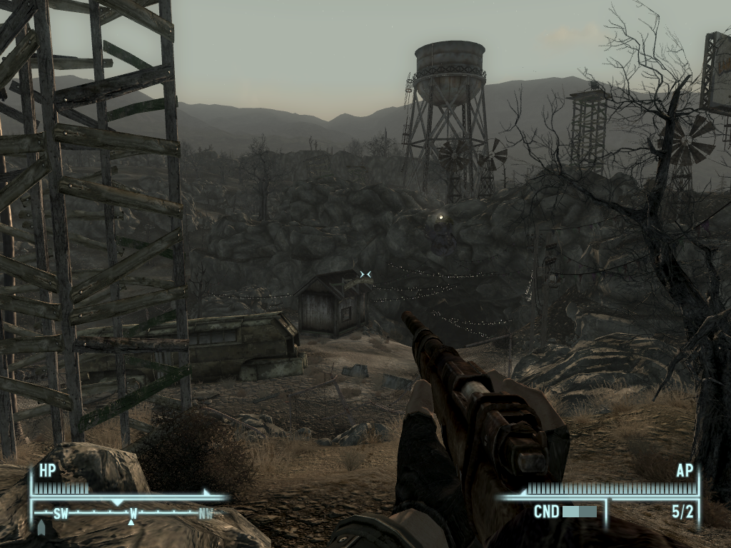 Una de las limitaciones del motor de Morrowind/Oblivion es que los interiores están en “celdas” separadas de los exteriores, no integrados en un mismo mapa. Por eso nunca hay ventanas en las casas por las que podamos mirar afuera y la luz que se filtra por los agujeros de las oxidadas chapas en Fallout no es más que un efecto de iluminación, el agujero no lleva a ningún sitio. A estas alturas, queda patente que aunque hayan mejorado la distancia de visionado y hayan añadido iluminación HDR y física Havoc, el motor de Morrowind ya se está quedando anticuado.