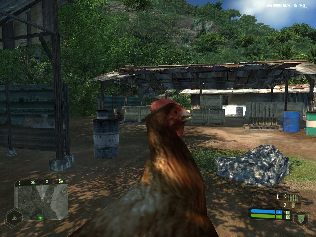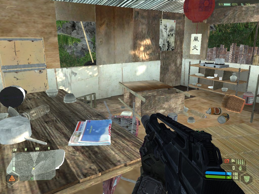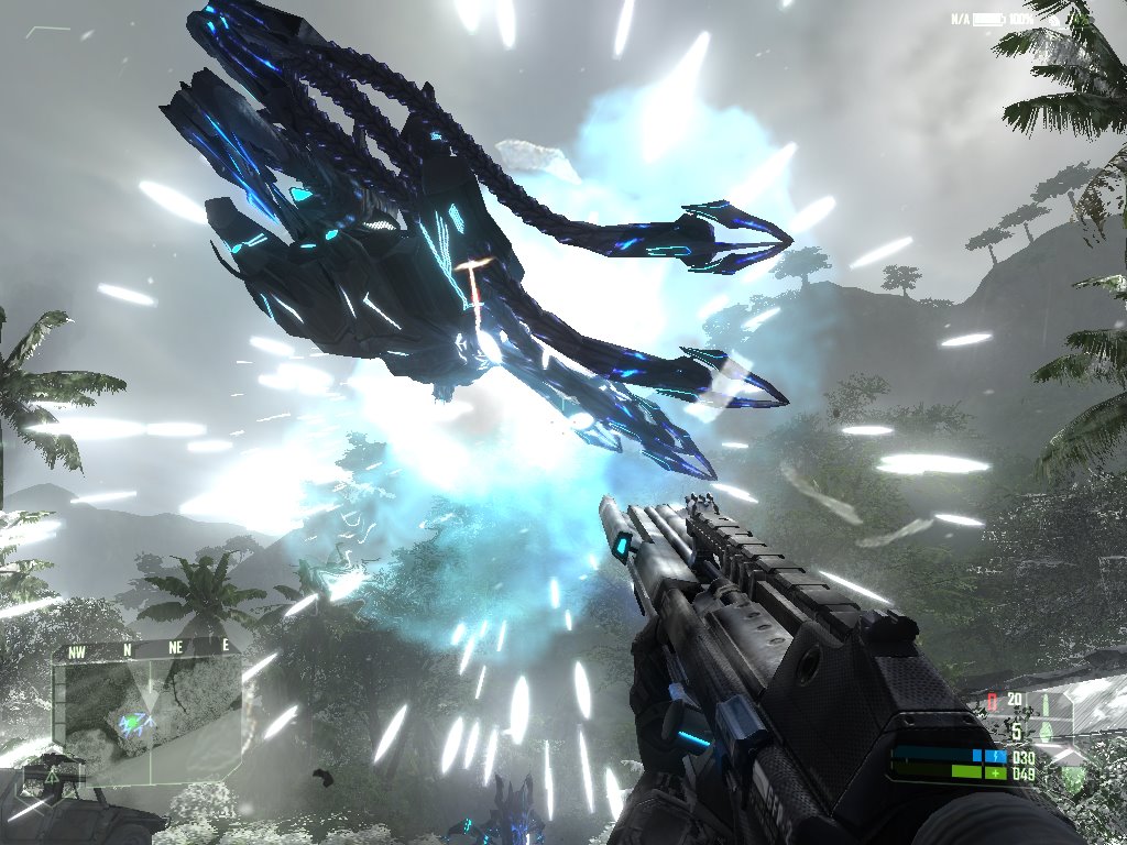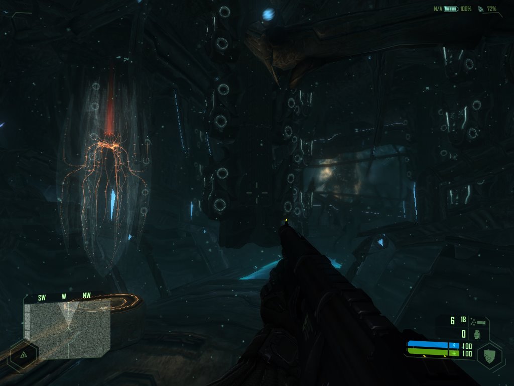 El diseño de estos escenarios, aunque a veces sea muy bonito, no sólo no lo es siempre, sino que además no es particularmente ingenioso. La zona costera de la isla y algunas colinas tienen puntos interesantes interconectados por carreteras y jungla, como una serie de zonas mejor o peor planificadas entre las que el jugador se desplaza, añadiendo algunas patrullas enemigas para divertirnos más. Y casi siempre guiándonos por el puntito verde de nuestro radar. Digo casi siempre porque en ciertas ocasiones se fastidia la señal del traje y el mapa se vuelve inútil. Esto ocurre, por ejemplo, en toda la extensión de las cavernas alienígenas del interior de la isla, un lugar donde enemigos desconocidos acechan y el diseño de niveles fracasa estrepitosamente. No es que el lugar sea diferente al resto del juego, que es comprensible porque es una base militar alienígena, es que no saben guiarnos por él. Lo primero que notamos después del aspecto extraño de la zona es que empezamos a levitar y Nomad exclama que está empezando a sufrir gravedad cero (habla con la esperanza de que, aunque él no recibe señal del exterior, al menos a él sí le puedan oír sus aliados). A partir de este momento nos desplazaremos flotando por ahí, cambiando radicalmente la navegación por el escenario. Y, sin que apenas tengamos tiempo de acostumbrarnos a esto, nos meten en un lugar en el que es complicado orientarse, no sólo por estar flotando, sino porque no hay casi nada que indique al jugador un camino. Este es el tipo de situación en la que el diseñador de niveles tiene que compadecerse un poco del jugador y llevarlo de la mano durante un rato sin que se note demasiado. Lo que hacen en esta parte de Crysis es, metafóricamente, meterte en una casa sin luz para que encuentres los pasillos a tientas sin ni siquiera darte una linterna. El momento cumbre de frustración en esta fase me llegó cuando entré en una sala enorme por una puerta inmensa y, mucho más adelante, vi una puerta similar pero más grande; me pasé unos tormentosos minutos intentando abrirla mientras luchaba por sobrevivir al creciente número de bichos y mi contador de munición llegaba a cero en casi todas mis armas. Pensaba que era culpa del diseño del nivel que yo no encontrara el interruptor para abrirla. Y era culpa de eso, sólo que por otro motivo: no había interruptor. Esa parte de la fase consiste en resistir a los alienígenas mientras esperamos un tiempo determinado (y largo) a que la puerta se abra sola, sin que nadie nos dé una pista de que la puerta se va a abrir sola. Una pequeña gran tortura para el jugador que responde a la desorientación, no la del jugador suspendido en el aire intentando evitar las embestidas de los bicharracos, sino la del diseñador de niveles que, evidentemente, no tenía claro él mismo lo que estaba haciendo.