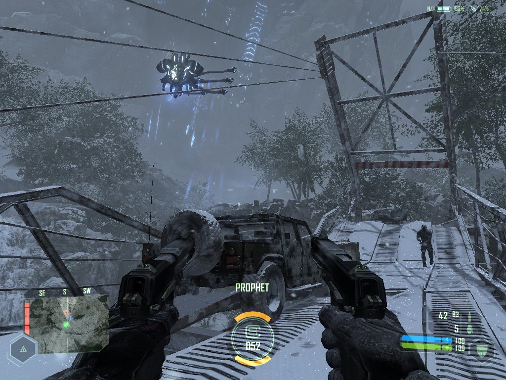 Por fortuna, para enfrentarnos a estos y otros peligros contamos con la inestimable ayuda del “nanotraje” (nombre “guay” allá donde los haya) de Nomad, el aspecto central del juego y marca de la casa. Como experimento está bien, pero no llega a satisfacer. En la intro se nos muestra una secuencia en la que el protagonista se está enfrentando a un montón de enemigos en una especie de campamento y se le ve haciendo uso de las características del traje, lanzando enemigos por los aires con la mano, resistiendo balas como si le estuviesen disparando bolitas de papel, corriendo como el viento y haciendo volcar un jeep militar con espectaculares movimientos acrobáticos y puntería infalible. Ahora, si tan sólo pudiera hacerse eso de verdad en el juego, podría haber sido tremendo. Lo de la puntería es siempre cosa del jugador, claro, pero las características del traje, por mucha utilidad que tengan, no son para tanto y no permiten hacer tales machadas. Se accede a ellas por un menú que, por defecto, se despliega pulsando la rueda del ratón; mientras la mantenemos pulsada aparecen las habilidades dispuestas en círculo y no tenemos mas que mover ligeramente el ratón en la dirección apropiada y luego soltar la rueda para que se active la característica escogida. Esto está bien porque es rápido y sencillo, pero es un arma de doble filo porque, si lo tenemos que usar en medio de la acción, nos distrae y dificulta la visión. Además, aunque centralizar el menú en un lugar sobre el cual tendremos la mano constantemente es buena idea, también habría estado bien que, a mayores, hubiesen incluido la posibilidad de asignar una tecla para cada habilidad para poder activarla sin “distraer los dedos” que usamos para mirar y disparar, aunque esto no es esencial.