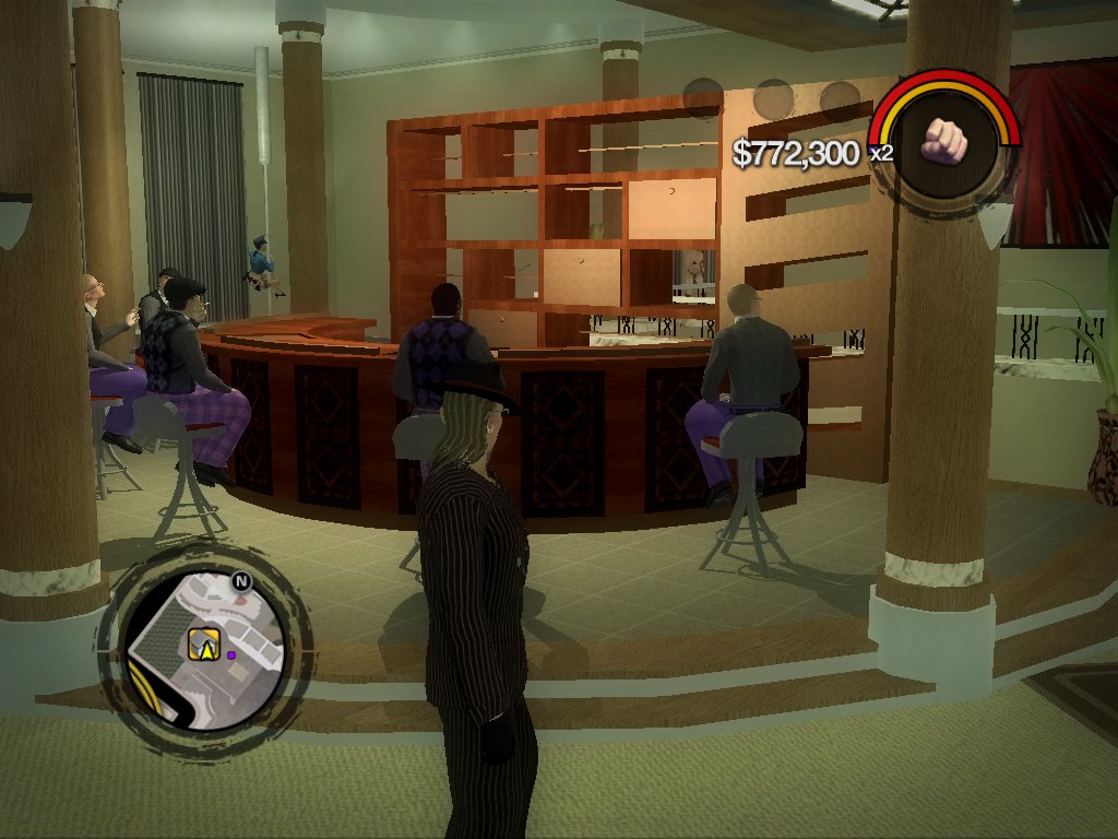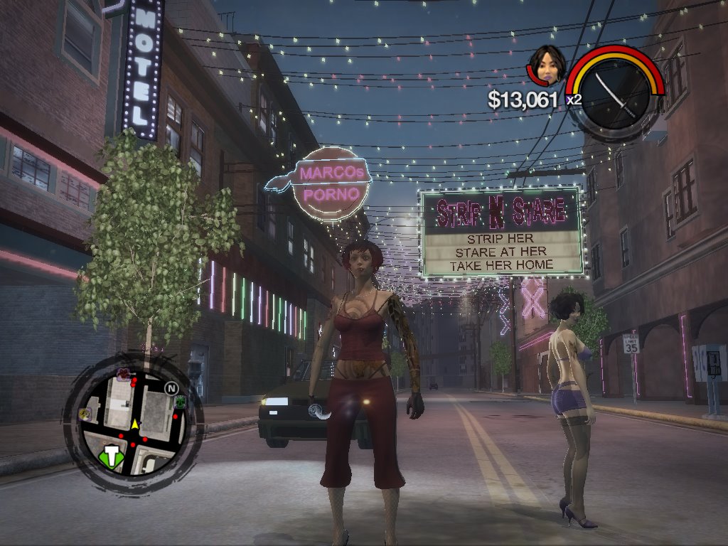Pero de todos modos la personalización es uno de los principales aspectos del juego y es bastante satisfactoria. Para empezar, se crea un personaje, hombre o mujer y se define su aspecto con un montón de opciones detalladas muy similares a las que se pueden encontrar en The Elder Scrolls IV: Oblivion o Fallout 3. Escogeremos su voz, su forma de caminar y sus gestos de provocación y cumplido, y más adelante en el juego podremos hasta escoger un estilo de lucha. Y no hay limitaciones: puedes crear un hombre con pechos o una chica muy guapa con voz de tío o lo que quieras porque el juego no te pone barreras. Y todo ello se puede cambiar en cualquier momento del juego recurriendo a las clínicas de cirugía plástica (lugar en el que también cambias tu estilo de lucha; otro signo de que a los desarrolladores les tira de un pie lo que hagas mientras te lo estés pasando bien). Con la ropa pasa lo mismo; existen varios tipos de tiendas de ropa y de joyas por toda la ciudad en las que se pueden comprar prendas y accesorios para todos los gustos, personalizar pequeños aspectos de su diseño en algunos casos y luego combinarlos como se quiera. Incluso la ropa interior. ¿Quieres ponerte una chistera, un bikini de tía (siendo personaje masculino), unas botas de motorista, unos guantes de látex, piercings en ambas orejas y maquillaje de mimo? Adelante. ¿Y mientras estás vestido así quieres ir a toda velocidad en una chopper con una katana en la mano decapitando ejecutivos trajeados desde la moto? Nadie te lo va a impedir. Bueno, atraerás la atención de los polis, pero te los puedes cargar a ellos también, mientras sobrevivas. Así que no te cortes: ponte tu americana de seda, tus pantalones de chándal, tus sandalias y tu casco de espartano y vete a espantar viejecitas meneando tus caderas delante de sus caras.