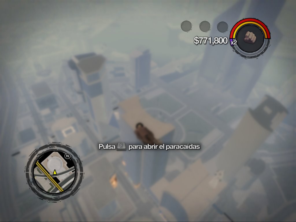 Recuerdo haber estado jugando con mis primos hace tiempo al GTA: San Andreas y turnarnos para colarnos en el aeropuerto, robar el único jet pequeño que había (en Saints Row 2 los vehículos aparcados se generan aleatoriamente cada vez que pasas por una zona, pudiendo encontrarte con varios tipos de aviones en un aeropuerto), arrancarlo con su difícil movilidad y volar hasta donde pudiéramos llegar antes de que vinieran unos puñeteros cazas a derribarlo y joder la diversión como si nos tirasen un cubo lleno de cubitos de hielo por encima. Solíamos hacer burradas como saltar del avión en marcha para que no nos mataran los cazas, pero eso resultaba en hacerse trizas contra el pavimento —salvo una vez que yo me quedé milagrosamente de pie sobre un poste eléctrico. En Saints Row 2 ¿sabes lo que pasa si te tiras de un vehículo aéreo en marcha? Que te aparece un mensaje en pantalla que te dice que pulses un botón (o tecla, según qué versión) para abrir el paracaídas. No tienes que comprarte uno ni equiparlo ni hostias, simplemente pulsas un botón y aparece mágicamente un paracaídas que te salva la vida. Es más, puedes pulsar otra vez el mismo botón para hacer que aparezca en el minimapa una zona delimitada por círculos concéntricos en la que puedes aterrizar, y si lo haces cerca del centro ganas más respeto. Y puedes volar con tu avión por donde te dé la gana sin que venga la Puñetera Fuerza Aérea de Stilwater a darte un bofetón en la mano por jugar con cosas que no debes. Maldita sea, si te compras un hangar hasta te puedes guardar allí tus aviones.