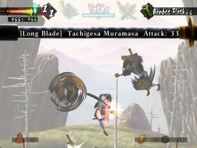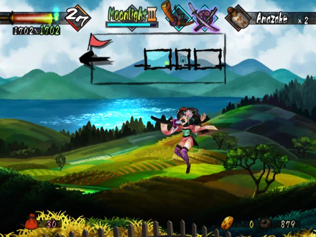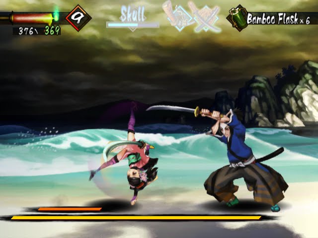 Afortunadamente, los jefes finales siempre son sorprendentes y originales, y varían según se juegue la historia de Momohime o la de Kisuke. Recuerdo un boss, en la trama de la primera, que me impresionó no por su tamaño ni su diseño espectacular. Es más, se trataba de un humano, un samurái. Lo realmente atractivo de este enfrentamiento era que se trataba de un duelo a espada contra el susodicho, en una playa, bajo un cielo tormentoso. La pequeña barca de pescador que flotaba cerca de la orilla y era sacudida por el oleaje contribuía al dramatismo de la escena. Este tipo de encuentros conceden un “momento de claridad” al jugador entre tanta repetición.
