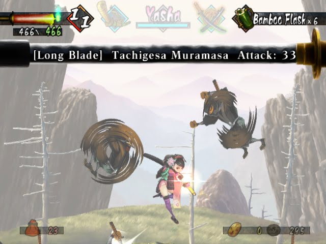 El modo de combate tampoco se puede decir que tenga mucha ciencia. Se basa en pulsar el botón A todo lo que se pueda, en combinación con las teclas de dirección y en diferentes circunstancias (en el aire, agachado, etc.). La mayor variedad que se va a encontrar el jugador a la hora de combatir, es la diferencia entre usar una katana y una tachi. La primera es más corta y rápida, permitiendo hacer combos espectaculares, y la segunda es más larga y lenta, pero tiene la ventaja de permitir al personaje flotar mientras golpea con ella y hacer combos en el aire, lo cual es muy útil contra cierto tipo de enemigos. Además, bloqueando ciertos ataques y golpeando a enemigos que se están protegiendo se desgastan las espadas y se rompen, así que hay que cambiar rápidamente a otra de las tres que llevemos equipadas mientras las rotas se regeneran.
