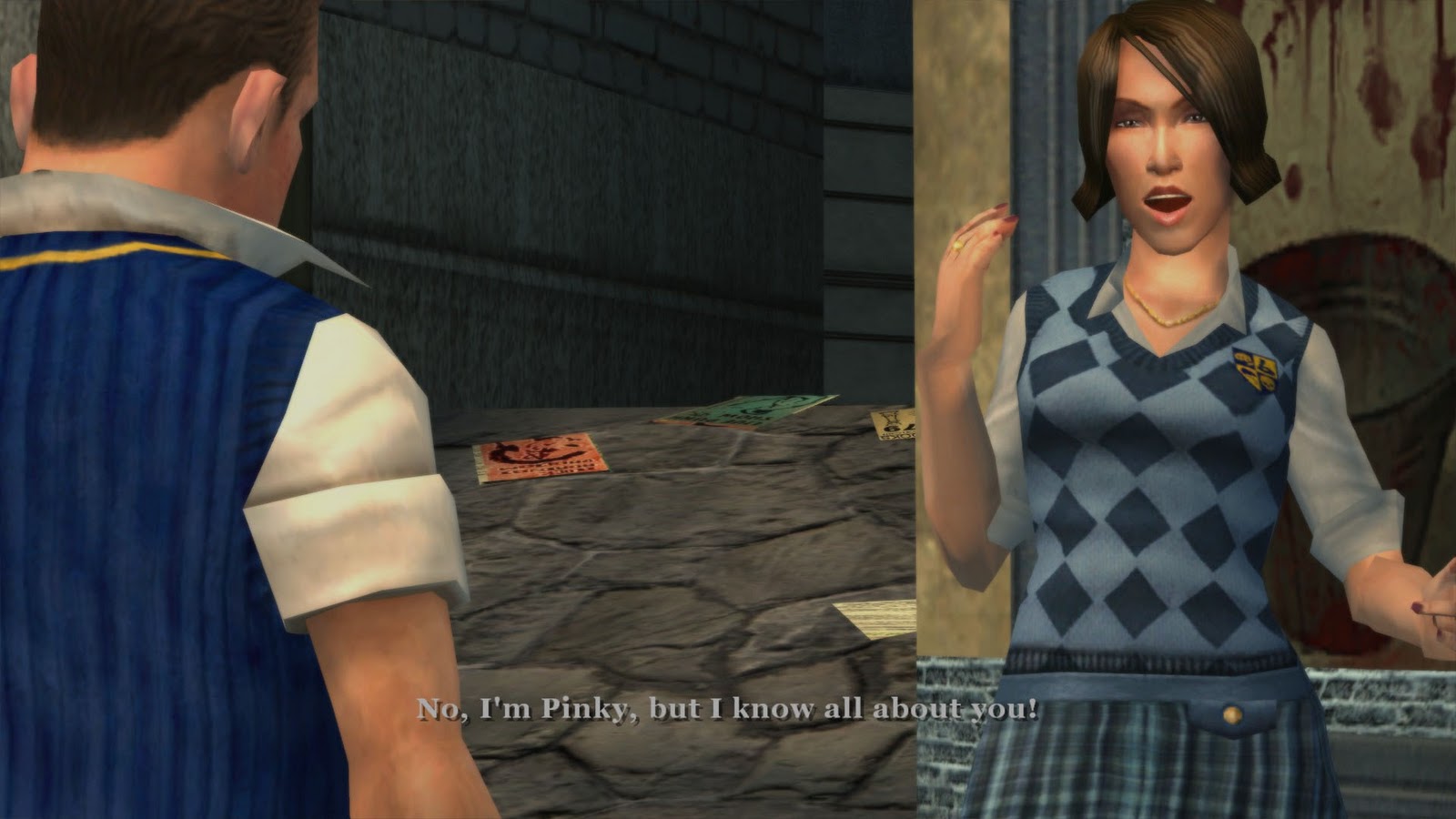 Entre esta fauna tan variada están, por supuesto, las chicas. Potenciales conquistas para el galán de Jimmy. El chaval se pondrá las botas con simplemente avanzar en la trama principal, ya que los eventos de la historia le llevarán a conocer y conquistar a la chica más destacada de cada facción. Con estas muchachas no se puede pillar hasta ese momento de la historia. Con las genéricas, por el contrario, es posible liarse mientras se tengan los medios necesarios. Y aquí es donde entramos en la mecánica de ligue de Bully. Esta es muy simple: al fijar a un personaje como objetivo, se puede interactuar con él de forma positiva o negativa según el botón que pulsemos. Con las chicas se empieza por decirles “me caes guay”, pero el objetivo final es conseguir besarlas. Al principio hay que encontrar cajas de bombones y flores para regalarles. Pero no se puede avanzar “a machete”. Hay que ir aprobando las diferentes fases de la clase de Arte para desbloquear mejoras en la interacción con las chavalas. Así, iremos logrando que nos den besos a cambio de regalos, que nos den besos sin necesidad de regalos, e incluso que los besos nos recuperen vida. Además, la animación del beso será cada vez más apasionada, pero solo por parte de la chica. Jimmy se limita a “recibir su justa recompensa”. Normalmente, la chica nos seguirá durante un rato tras el beso, y es posible caminar con ella de la mano. Podemos incluso enrollarnos con otra en frente de ella, lo cual resultará o bien en una “pelea de gatas” o en una tremenda patada en los innombrables para Jim. Y yo este sistema lo veo demasiado simple. No hay verdadero desafío en conquistar a las chicas y no tiene mayor impacto sobre ninguno de los personajes. Nadie puede decir “Fulanita está saliendo con Jimmy”, ni nada por el estilo. De acuerdo, ese no es el tema central del juego, que se beneficia de que su sistema de ligoteo sea ligero, pero se echa de menos algún tipo de desafío o consecuencia. Además, las mujeres siempre salen perdiendo. Jim puede hacer lo que le dé la gana, y enrollarse con otra en frente de la acompañante es algo que siempre se puede hacer. Es decir, la “pareja” del protagonista no intervendrá hasta que el acto haya finalizado. Y cuando lo haga, básicamente las dos muchachas se tirarán del pelo y se darán una patada, mientras nosotros podemos mirar o pasar de todo. Como mucho, la parte ofendida pateará a Jim en la entrepierna y saldrá corriendo. Pero es puramente anécdotico. Y encima Jim utiliza “frases de pillar” intencionadamente tontas que siempre le funcionan, mientras las chicas le responden con deseo y le alaban por lo bien que besa. Claro, está bien que el chaval use frases graciosas, al fin y al cabo eso forma parte del tono del juego. Pero que siempre quede como un “jefe” haciendo eso y que las chicas “caigan” cada vez con esa táctica tan poco elaborada es bastante denigrante hacia ellas. Es gracioso, pero no hace nada bueno por el público femenino. Se podría haber alcanzado un mayor equilibrio entre un sistema de ligue sencillo y un sistema de consecuencias significativo. Además, con lo excelente que es el guión del juego, seguro que se podrían haber escrito unos diálogos más profundos y convincentes en las situaciones amorosas.