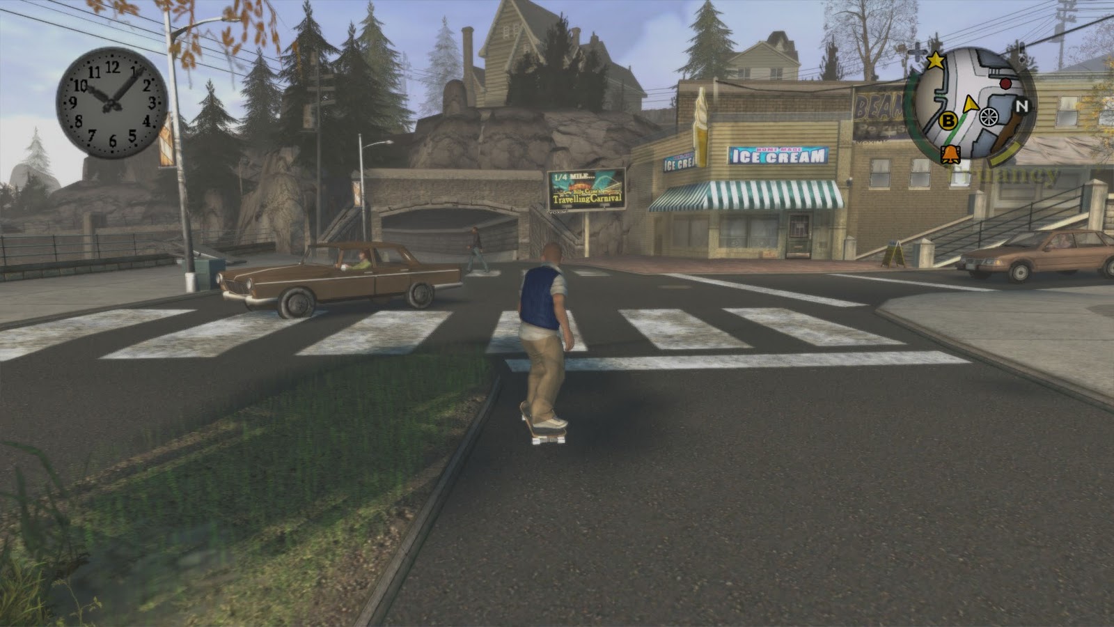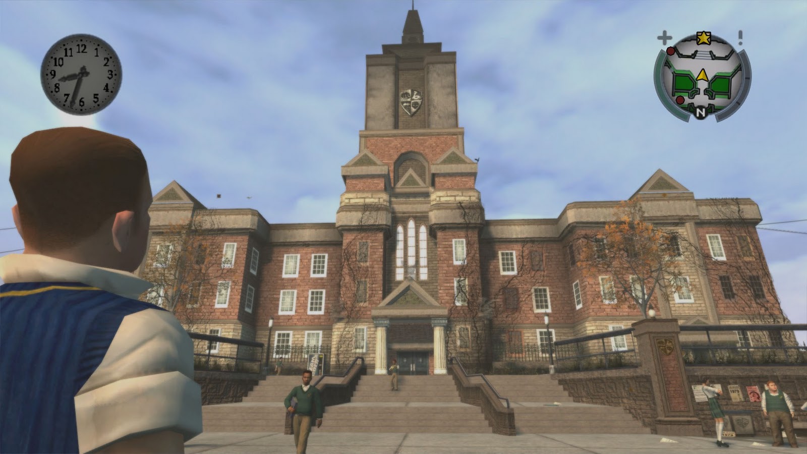 Un marco musical perfecto para un mundo rico y detallado. Pequeño, cierto, pero profundo. La superficie explorable es signigficativamente menor que en la mayoría de juegos de mundo abierto de la época, y ya no digamos de los últimos años. Y sin embargo uno siempre está descubriendo nuevos rincones en la ciudad de Bullworth. El territorio está lleno de pequeños detalles, de superficie explorable que suma y suma profundidad a la exploración. Así se crea el efecto de ver el mundo a través de los ojos de un niño: nos movemos por una zona pequeña, pero a nosotros se nos hace grande y repleta de sorpresas, escondrijos, peligros, recompensas, etc.