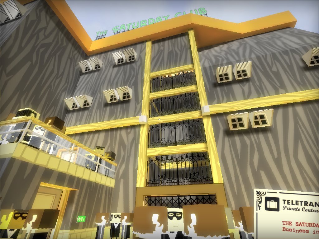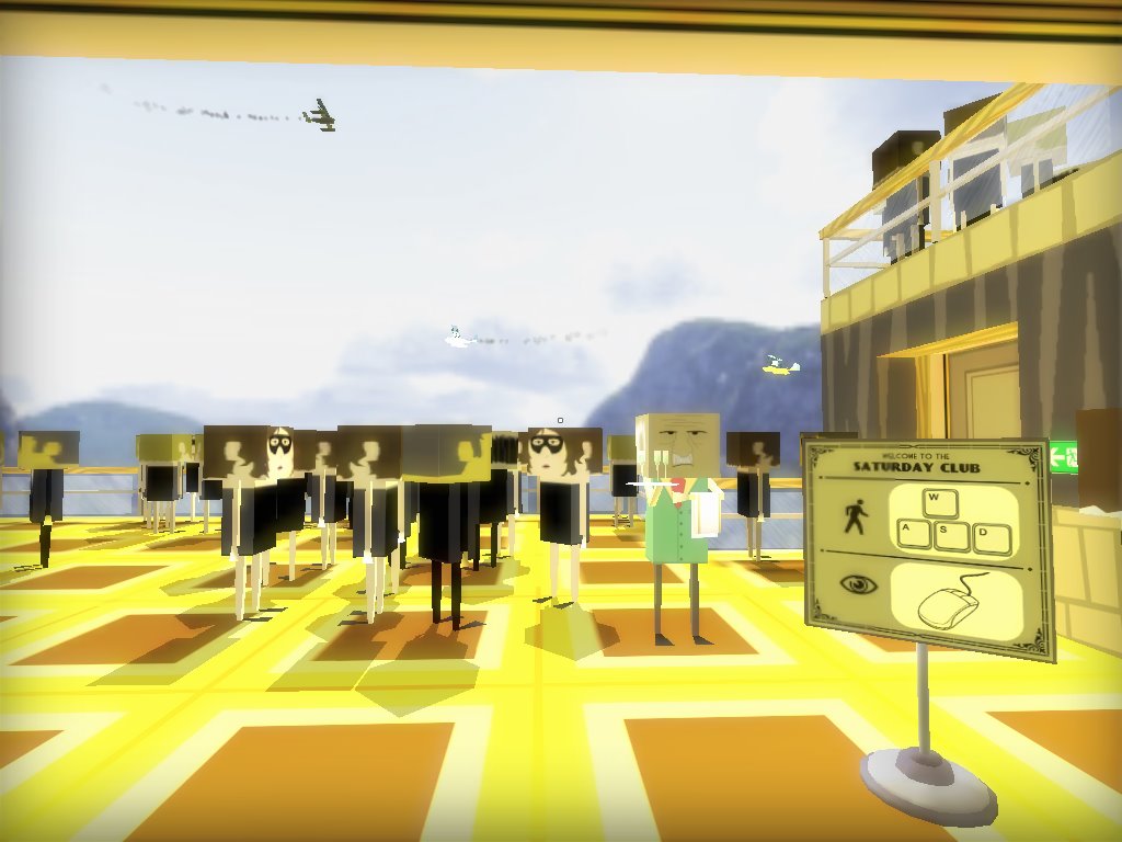 Todo comienza en un ascensor que nos lleva hasta la enorme y abarrotada terraza de lo que parece ser un club social, con viejos camareros ajetreados, constantemente llevando bebidas de un lado para otro. En nuestra mano derecha, una pequeña tarjeta nos ofrece una breve y sencilla primera instrucción sobre nuestra misión. El especto visual del juego nos impacta en este mismísimo primer contacto: los colores intensos y vibrantes, los personajes con escasos polígonos y cabeza desproporcionada en forma de cubo… . Incluso la música es llamativa, pues esta escena está envuelta en un alegre y pegadizo cha-cha-cha que parece haber sido compuesto expresamente para este ambiente.