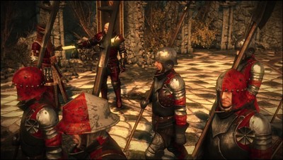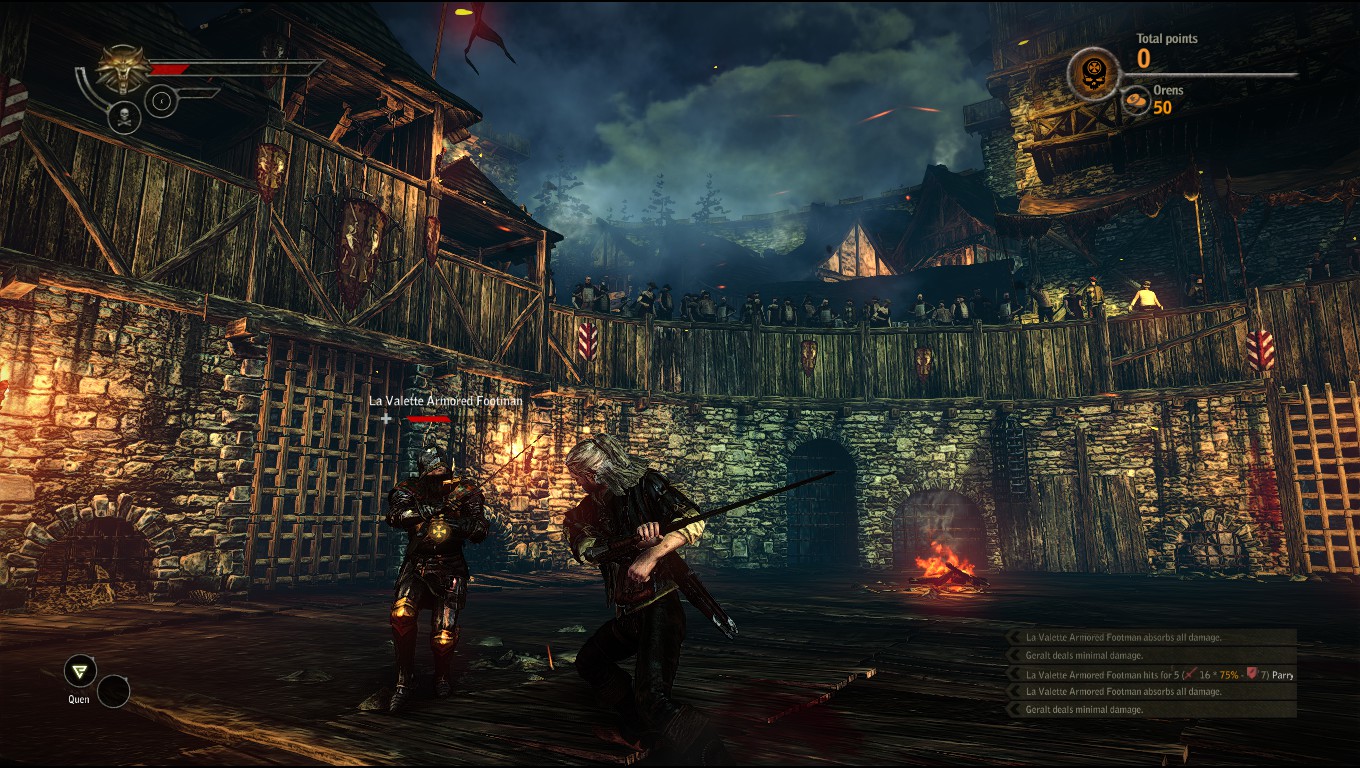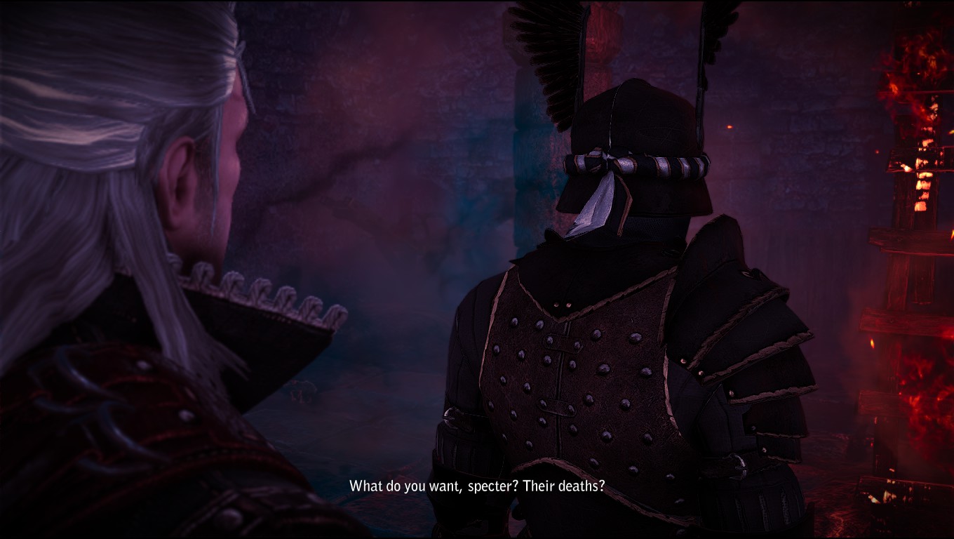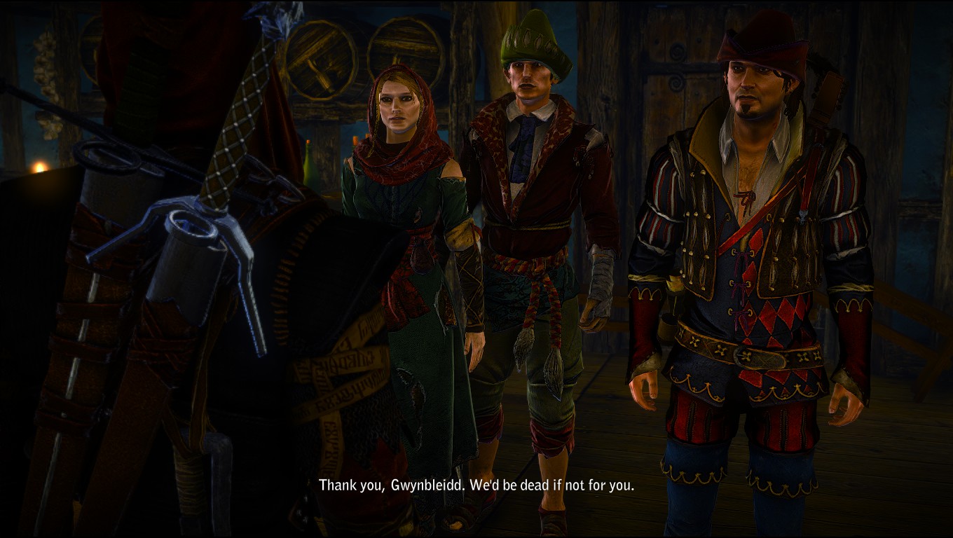 No puedo evitar recordar el caso en particular de un soldado de Flotsam, el pueblo del primer capítulo. En el patio de la mansión del cacique local, soldados, mercenarios y prostitutas pasan el tiempo divirtiéndose, bebiendo y jugando. Aquí vemos a dónde va a parar parte del dinero que el líder extorsiona a los mercaderes locales: desperdiciado en celebraciones efímeras en medio de un pueblo que se hunde en la pobreza. El soldado en cuestión está borracho cuando Geralt llega al lugar y pasa el tiempo cantando una canción a sus compañeros en torno a una hoguera. La letra es vulgar, soez e inmadura. Trata temas sexuales con la seriedad un chaval de trece años. Mientras tanto, una de las prostitutas le desafía a “divertirse como un adulto”. Nunca vemos una respuesta al desafío. Esta pequeña anécdota es representativa del tipo de sociedad en la que el brujo se desenvuelve: un montón de barro que atravesar a trancos, poblado por adultos incapaces de tener responsabilidad o de reconocer los fallos en su moralidad. Es como si Geralt fuera el único adulto en medio de un grupo de niños que se pelean por los motivos más ridículos y se divierten con lo primero que encuentran. Y estos niños consumen dinero, arruinan propiedades y quitan vidas. Pero son ellos quienes conforman y defienden la sociedad de los humanos. Son tan molestos como necesarios. Es un factor que aumenta la simpatía del jugador por la causa de los “terroristas” élficos. A veces uno se plantea que en el mundo de The Witcher debería haber menos humanos, menos elfos y más brujos. Pero la “realidad” es la que hay y hay que sobrevivir en ella como mejor se pueda.