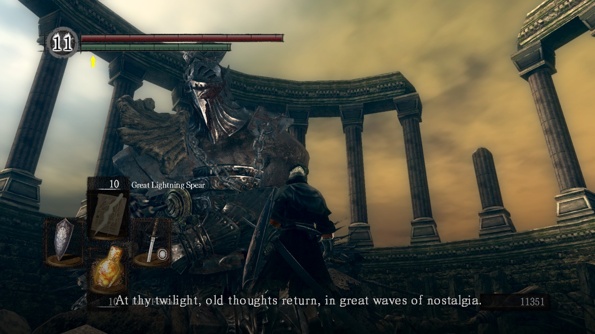 En lugar de una estructura de quests al uso (yo las llamo contractuales. Aquellas que consisten en que el personaje jugador hable con un NPC, este le encargue una tarea y al completarla dicho NPC le otorgue una recompensa) Dark Souls funciona ofreciéndonos un único objetivo concreto y dejándonos la vía libre para completarlo y avanzar. Tras el prólogo/tutorial el juego propiamente dicho empieza con el requisito de tañer las dos campanas del despertar. Nos enteramos de esto hablando con el “guerrero alicaído” —uno de los múltiples vínculos temáticos que el juego comparte con su predecesor Demon’s Souls— pero esta acción no es obligatoria y por lo tanto el jugador puede potencialmente perderse esta información. Es más, los jugadores sin decencia ni paciencia pueden optar por atacar a este personaje nada más verlo, y en la serie Souls, los NPCs muertos desaparecen para siempre de la partida y los agredidos permanecen hostiles. Existe la —improbable pero real— posibilidad de perderse completamente esta información.
