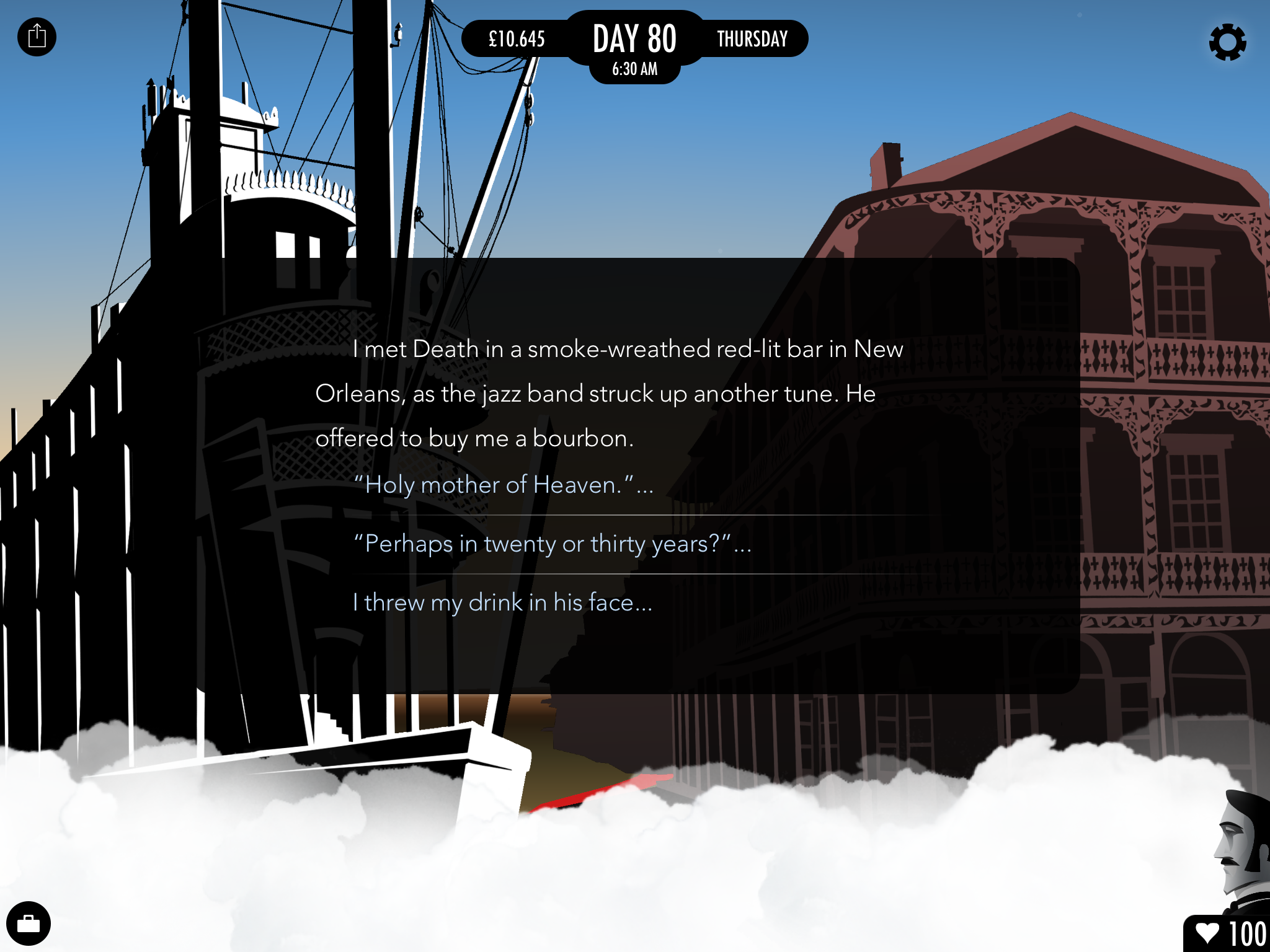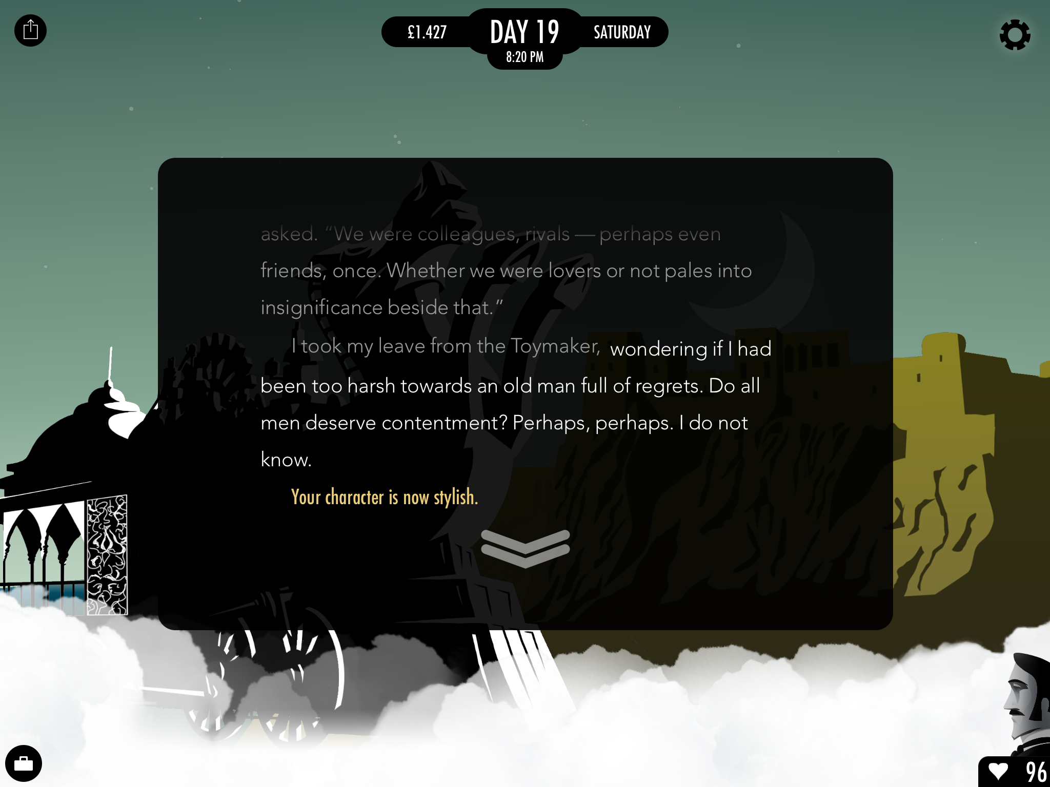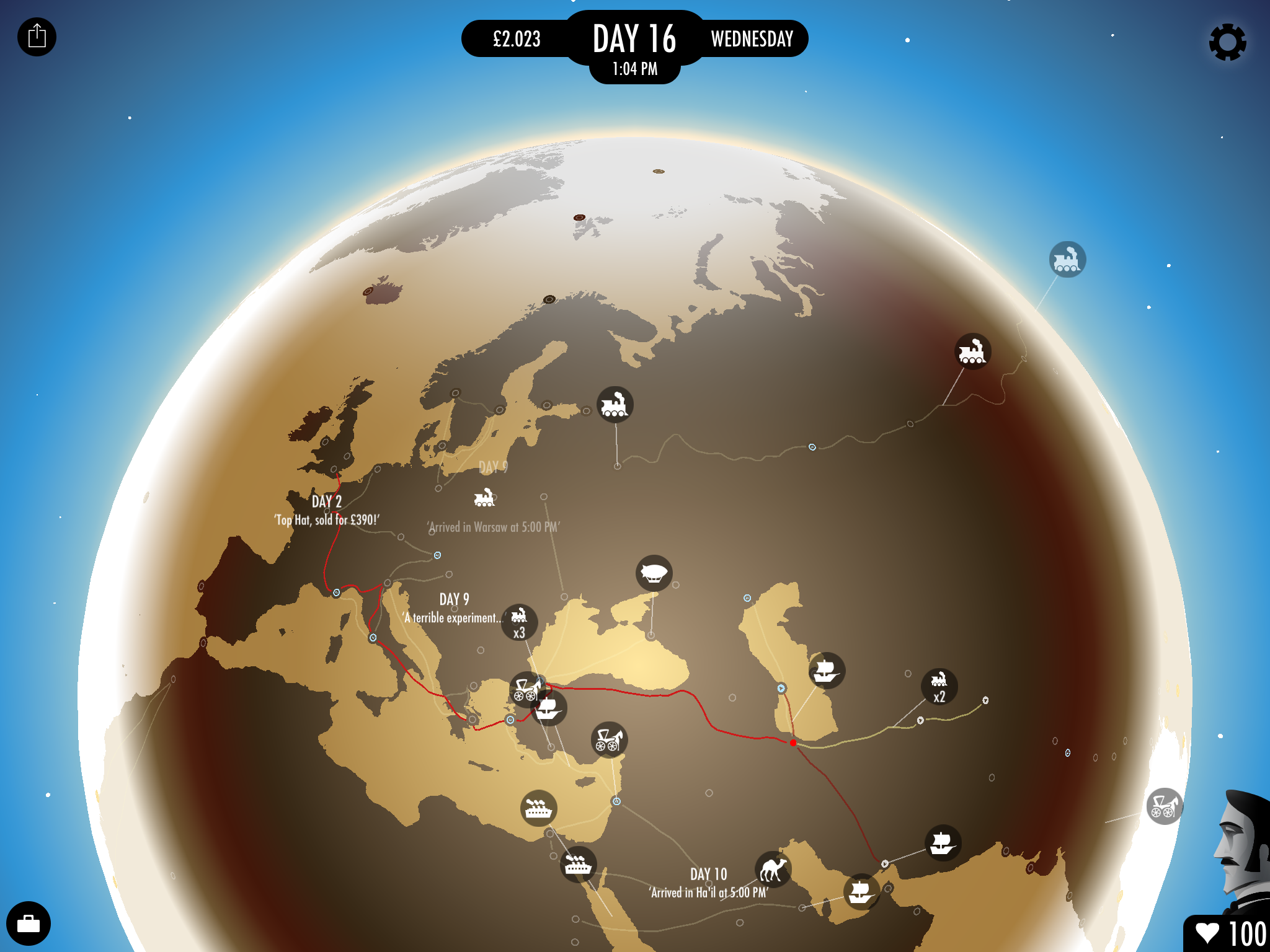 Con todo, el grueso del juego/novela interactiva es altamente recomendable. Muy rejugable pues incluso en destinos repetidos podemos tomar decisiones distintas que tengan repercusión sobre nuestras opciones a la hora de viajar. La factura técnica es sólida, el juego está diseñado para poder jugarse tanto en una orientación apaisada como una vertical y, aunque personalmente recomiendo jugar en un iPad u otra tablet, es perfectamente funcional en un smartphone también. Como extra, un modo online asíncrono tipo Dark Souls nos muestra a otros Passepartouts en el mapa y las rutas que han tomado, acompañados de un globo de texto que da una pista sobre qué evento están viviendo. Al terminar una partida se nos presenta una pantalla de estadísticas que nos impulsa a intentar un nuevo viaje por otra ruta, ya hayamos ganado o perdido la apuesta. No existen muchos videojuegos del género de literatura de viajes, a pesar de que muchas aventuras nos lleven por incontables mundos fantásticos y futuristas. 80 Days cubre ese vacío de forma muy digna y con mucho estilo, como el propio Monsieur Fogg.