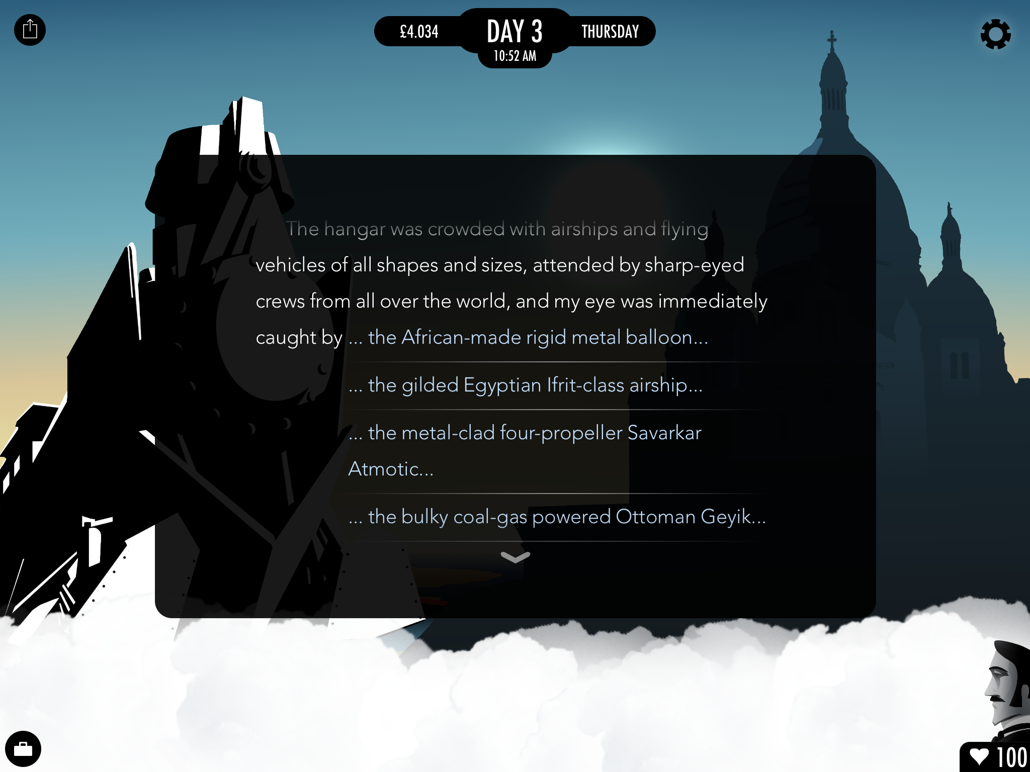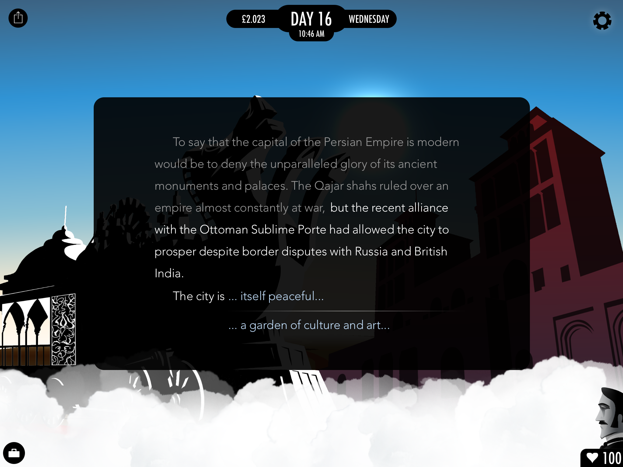 El título que nos ocupa es un excelente ejemplo de este estilo. Desarrollado en el estudio inkle y producido por Jon Ingold —uno de los nombres más respetados en el campo de la ficción interactiva y autor de, entre varias obras, el misterio detectivesco Make it Good y el ganador del premio XYZZY 2001 por la fantasía renacentista All Roads— 80 Days es una adaptación steampunk de la novela de Julio Verne La vuelta al mundo en ochenta días. Antes de que salgas corriendo ante la mención del steampunk, me veo obligado a precisar que en el juego que nos ocupa, los adornos propios de este género son llevados con buen gusto y aportan textura y asombro a los viajes de Monsieur Fogg. No se trata del grotesco pastiche friki que tan común y vilificado se ha vuelto en Internet.