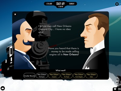 Cuando estamos en mitad de un viaje tenemos varias opciones. Podemos atender a nuestro amo, leer los periódicos o conversar con algún personaje a bordo del transporte en que nos encontremos (que puede incluír al propio Fogg). En la pantalla de mapa, el juego siempre transcurre a un tiempo acelerado lo que significa que, a excepción de los viajes más largos, solo tendremos oportunidad de hacer una de estas tres cosas. Las conversaciones con NPCs nos ponen en una ventana en la que Passepartout aparece cara a cara con su interlocutor. Debajo de los retratos, se nos presentan una serie de temas de los que hablar que normalmente son rutas y nombres de ciudades, pero también pueden ser objetos y mercancías. Estas conversaciones son generadas sobre la marcha en base a dónde nos encontremos y hacia dónde vayamos. En claro contraste con la prosa de los segmentos de texto, estas conversaciones siempre resultan robóticas y poco naturales con los NPCs a veces ignorando completamente el contexto de nuestras preguntas y respondiendo algo sin ninguna relación, o limitándose a repetir frases “plantilla” que nos sacan de la inmersión literaria que 80 Days consigue tejer. Por si fuera poco, las conversaciones terminan abruptamente cuando, debido al tiempo acelerado de nuestro viaje, nos aproximamos a nuestro siguiente destino.