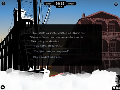 Este aspecto de gestión de recursos, aunque narrativamente apropiado, no está estructurado como un sistema sofisticado ni un juego robusto en sí mismo. Es simplemente una capa más para aportar un toque de simulacionismo a la trama que vamos construyendo. Nuestras decisiones estratégicas sobre a dónde viajar cuánto tiempo esperar y qué reintegros sacar del banco están limitadas por el avance inexorable de la trama. Por muy ramificada que esta sea, su desarrollo es estricto. Tan sólo se nos permite viajar “hacia delante” así que no podemos hacer cosas como un pequeño viaje lateral mientras esperamos por una transacción del banco en otra ciudad, que nos permita volver y tomar una ruta más favorable. Una vez que abandonas una ciudad, no es posible volver a ella en la misma partida, con lo que tenemos que anticiparnos lo máximo posible a las oportunidades que se nos presenten, e intentar asegurarnos de que tenemos suficiente efectivo en mano para poder tomarlas.